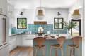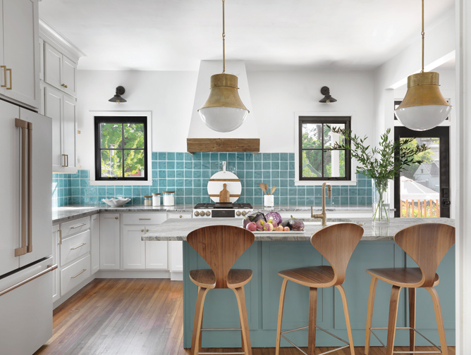 This local interior designer with Castle Design remodeled her own kitchen into a colorful space that is a bright spot in her 100-year-old Webster Groves home. The striking blue hand-glazed backsplash tile was the inspiration for the rest of the design. Blue reminded the designer of her hometown in California with vivid coastal ocean views. She relocated the kitchen to the dining room, which had a larger footprint with casement windows that are now a focal point in the new kitchen. The details in the kitchen are a mix of the past and present. The custom white hood is finished with century-old reclaimed barn wood. Contemporary wood counter stools and oversized brass light fixtures balance out the transitional design. Now the cheerful heart of her home, this designer brought a modern eclectic flair to her Midwest kitchen.