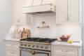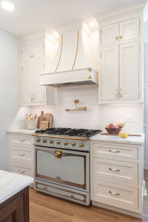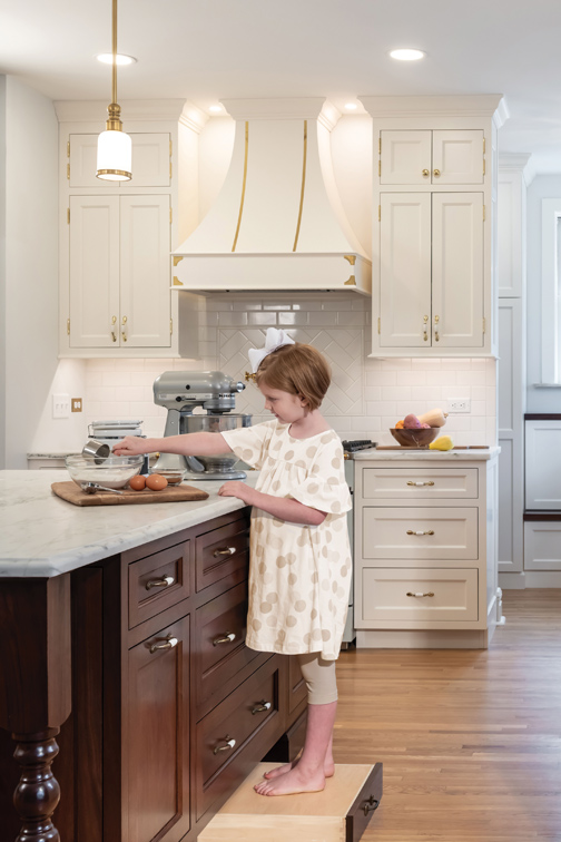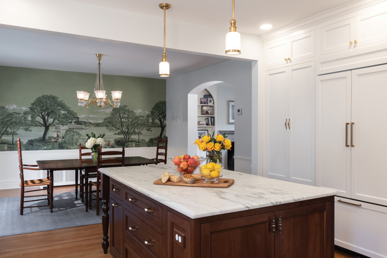 LeCoeur Design’s motto behind this University City renovation was “a vintage vibe for a modern tribe.” With the goal of creating an open concept that was multifunctional and stylish, the designer reworked the existing space to function as a kitchen, dining room and mudroom. The first priority in the remodel was to open up a wall between the kitchen and dining room, which exposed an original wall mural of the Mississippi River to the rest of the space. The deep greens, creams and browns of the mural set the color palette for the kitchen. The perimeter cabinets are a custom-painted maple, while the island features local Missouri walnut for contrast. The Montclair Danby marble countertops have a striking green veining and creamy background, perfectly fitting into the color scheme. The crowning jewel of the kitchen is the special designed La Cornue Albertine range. The designer pulled inspiration from the unlacquered brass on the range and repeated it in the pot filler, bridge faucet, pendant lights and hardware. The homeowner loves all things historic and St. Louis, so the designer searched local antique shops and architectural warehouses for vintage and St. Louis touches to complete the space. This timeless kitchen will serve the family for years to come.