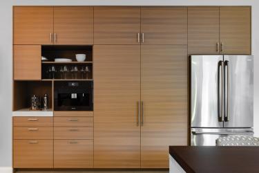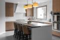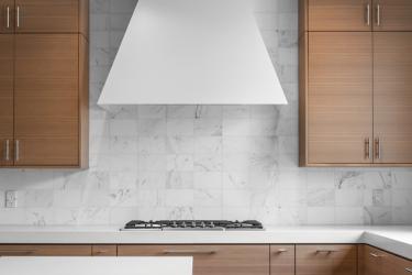 The redesign of this modern kitchen focused on quality and integrity. Designer C&M Interiors developed a custom stain and finish for the quarter-sawn walnut, which entailed hours of applying stain, bleaching and repeating to achieve the perfect tone. The seamless cabinetry is balanced by the quaint lighting fixtures. The details are subtle with a hint of youth and play on textures. The wood countertop is nestled into a 3” thick concrete-look Caesarstone. Stacked marble from countertop to ceiling creates a sense of luxury. Functionality was key, and the designer created the space with the way we live today in mind.
