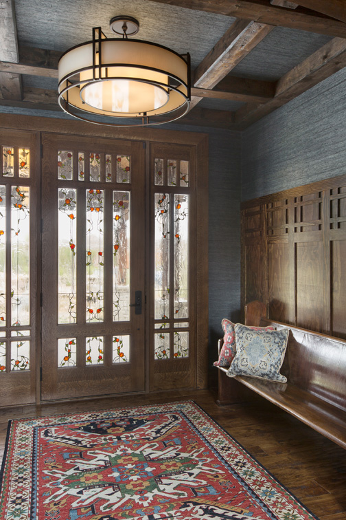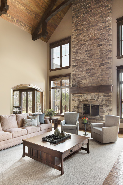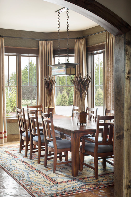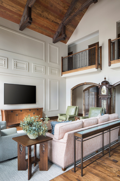The great room combines custom craftsmanship with special attention to lighting and ambience. The faux beams were the room’s main focus and key to the home’s architectural style; the timbers were chosen from Missouri River Timber Co. and distressed perfectly to the homeowners’ specifications. Remote-controlled LED strip lights were added to the topside of the beams to give the room an adjustable glow at night. Handscraped 7-inch hickory plank floors by Historic Floors run throughout the main level, giving each room a relaxed and cozy touch. A 30-foot stone fireplace with a custom mantel makes a statement on the room’s back wall. Around the room are wood details on the walls, which Kim Taylor-West designed with the homeowners. “We wanted the walls to have their own personality without competing with the all-important beams and stained glass,” she notes.