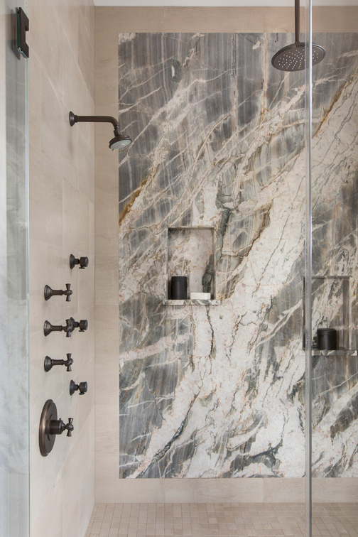 Perhaps the most striking element of the owners' bathroom is the shower. Within is a large, unbroken slab of quartzite sourced from Global Granite and installed by the skilled and capable hands of SS Stone & Design. “The quartzite installation was definitely the trickiest part of the home’s design, but it turned out stunningly and really paid off,” Kim says.