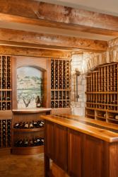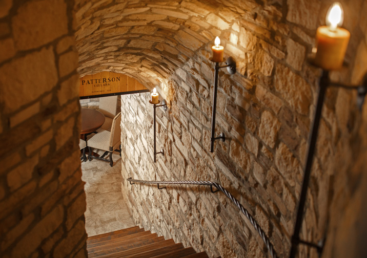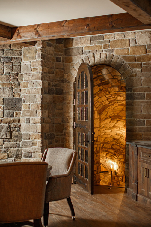 Both avid wine lovers, the Pattersons knew they wanted a personalized wine cellar for their vast collection. Working with Taylor-West and Lamp Wine Cellars, they created a fully refrigerated space that could hold hundreds of bottles in a temperature controlled environment. “They drew inspiration from French wine cellars, and we designed the space to look like a dungeon or cave,” Kim comments. They implemented this look through the use of stone throughout the room and barrel vaulted staircase; located in a sub-basement 20 feet farther into the ground made achieving the dungeonesque atmosphere that much simpler. The entrance to the cellar is guarded by a custom dungeon door made by The Scobis Company and Classic Glass.