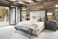 The owners wanted their bedroom to be clean and clutter-free and for it to showcase the wife’s favorite piece of furniture, her armoire. To achieve this look, the design team opted for large his-and-hers closets to eliminate the need for dressers. Behind the bed laden with custom pillows from FabricWorks and a smoky gray leather headboard is a hickory accent wall set in a pattern of different stains. The husband and wife can walk from their bedroom to the luxurious back deck area, overlooking their outdoor space designed by Poynter Landscaping and Jeff Day Architecture, LLC.