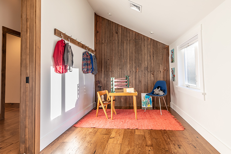 Although the couple’s driving focus was to maintain the structure’s heritage, a top priority was to do it in a way that protected the environment. They installed geothermal for heat and solar fields for electricity; they reused materials wherever possible—troughs became benches, barn doors were re-purposed on track systems to create flexible walls, and the wood exterior siding that was removed was added to the interior space to create feature walls. Even the wood that was used for flooring on the second story was harvested from the surrounding forest over the course of a decade and dried in the barn.