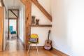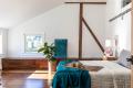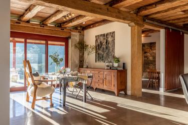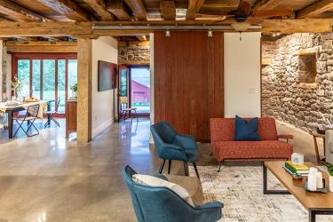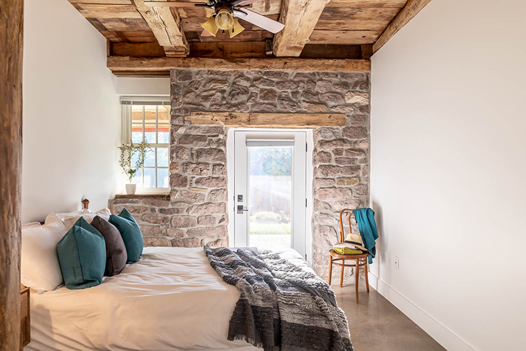 The Montroys took a utilitarian approach to the interior design of the space, preserving existing walls and only adding new ones where necessary. They made a point of leaving the simple beauty of original construction techniques exposed, details like the joinery, hand-hewing marks on the beams and stone walls. They also saved the family’s own markings, places where relatives had scratched into the wall to indicate the amount of grain bags that were being stored each year.