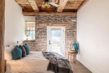 When Chris and Julia Montroy, a husband and wife design team living in St. Louis, began the years-long project to transform a portion of her family’s 200-plus-year-old bank barn in Lancaster County, Pennsylvania, into a modern home with full amenities, they didn’t just want to make it warm and functional. They wanted to preserve its centuries-old details for future generations to discover—like how sunlight moving through the space creates a magical feeling as it bounces off the beams or how past relatives once used an old license plate to patch a hole in the wall.
