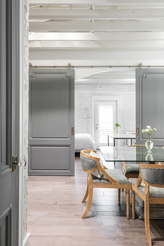 Yet perhaps the most unique aspect of the home, says Andrea, are the antique doors sourced from Fellenz Antiques, originally New Orleans and France painted in custom gray chalk paint and surrounded by white frames. “The doors enhance and unify the apartment. Although the colors in the other rooms may shift, our doors unify everything.”