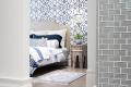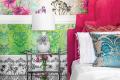 There, her love of vibrant shades reaches new heights with the room’s five different wallpapers. The accent wall behind the bedframe sports a floral cotton wallpaper, originally meant for shower curtains from Designer's Guild, along with green damask wallpaper with metallic flakes and a gray and white cartouche wallpaper.
