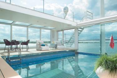 For the sports-minded, Emerald Star has just about everything: a small fitness center with bikes, weights and a rowing machine, a sun deck with a cushioned jogging track and a golf putting course. On the aft deck is a beautiful infinity swimming pool—very unusual for a river ship—that, in the evening, transforms into a comfortable movie cinema with seating for up to 30 guests.