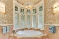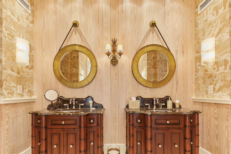 The last room to take on a new personality was the family room, which was previously a media room. The fabric Gigi suggested for the drapery panels and pillows brings in additional tones of golds and greens, which make the room feel very warm and cozy. A nook that had been for the media equipment was transformed into a wet bar. The homeowners added a special touch in the wood floor in front of the bar with a compass rose, the husband’s idea, that has the latitude and longitude of the house. Little details like this bring the story of the home to life.