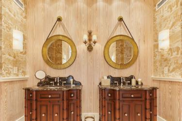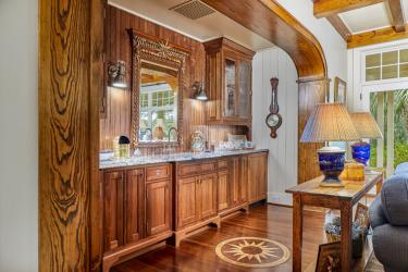 The last room to take on a new personality was the family room, which was previously a media room. The fabric Gigi suggested for the drapery panels and pillows brings in additional tones of golds and greens, which make the room feel very warm and cozy. A nook that had been for the media equipment was transformed into a wet bar. The homeowners added a special touch in the wood floor in front of the bar with a compass rose,  the husband’s idea, that has the latitude and longitude of the house. Little details like this bring the story of the home to life.