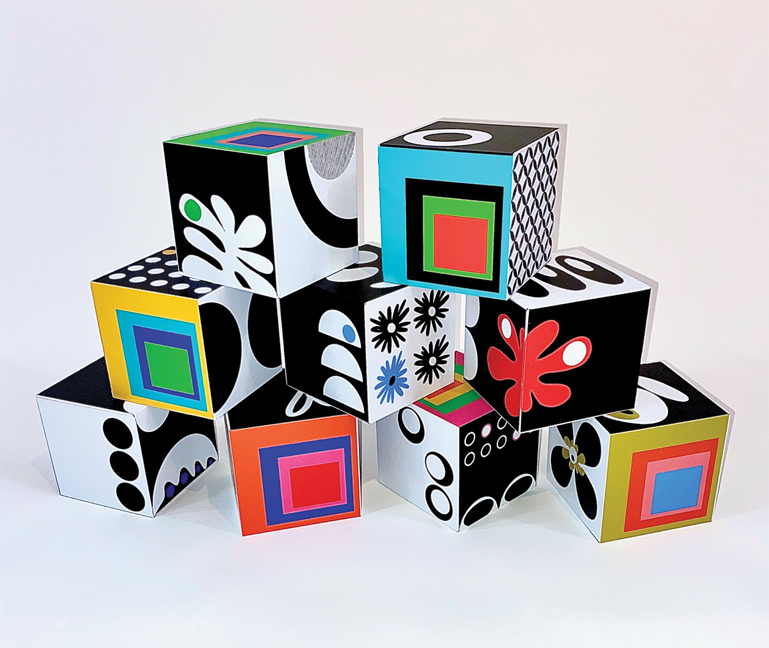 On the flip side, Zigman also imagines her cubes being part of a 3-D art installation in places like a corporate lobby or a health care facility, “maybe mounted on a corner,” she says. “Imagine three sides painted in a warm tone and the other three sides in a cool tone, so depending on how you enter the room, it can look completely different.”