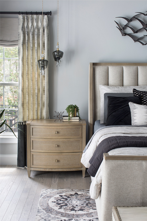In the primary bedroom, located on the home’s main level, “I wanted to give them a feeling of a retreat—peaceful and relaxing,” says Wideman, who used a soothing gray, taupe and cream color palette. New French doors lead out to the new hot tub and redesigned patio spaces.