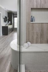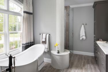 Wideman also used Sherwin-Williams Urbane Bronze for new cabinetry in the home’s primary bathroom. The piece-de-resistance, however, is her redesign of a column, which previously sat on the edge of a tiled jetted tub which was removed and replaced with a freestanding tub. Leaving the original shower footprint intact, Wideman widened the column’s base and extended it into the shower, where it provides a seating ledge. She clad the column in 3/8” by 3/8” glass tiles and topped the shower bench and vanity counters in quartz.