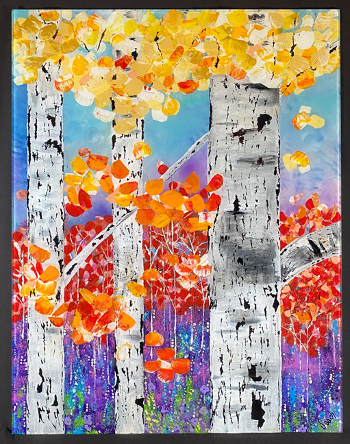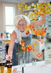 Aach has created reverse glass paintings for residential and commercial clients, including the healthcare industry, which holds a special place in her heart. Before she embarked on her art career, Aach spent 25 years working as an anesthesia nurse. “I can still help people, nurture people; I can influence how they feel with my art versus physical care,” Aach says. “Art has a profound effect on people . . . if you see one of my art pieces as you walk into the hospital, and you get a smile on your face, that’s my goal.”