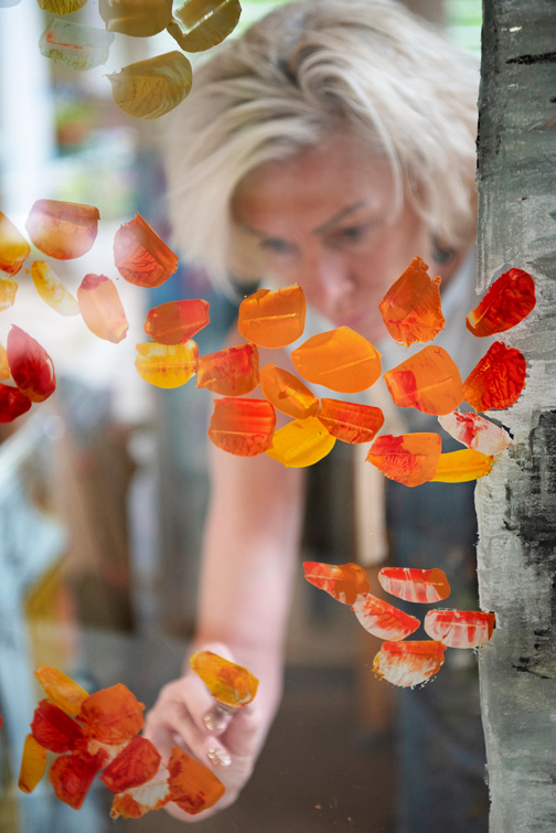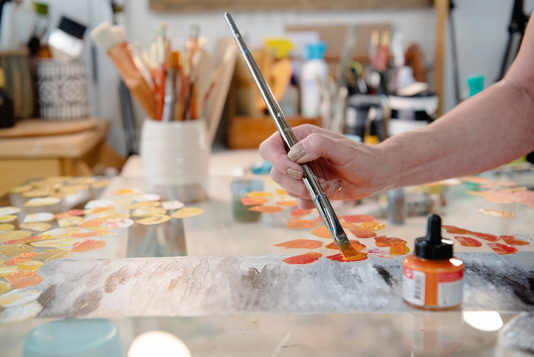 Painting on ¼–to–½-inch thick tempered glass, Aach’s pieces have ranged in size from 10 inches square to 9 by 6 feet, which creates a challenge because she likes the glass to lay flat while she works on it. She has two work tables in her studio, and for larger pieces, she lays the glass across them. In some cases, she actually climbs a ladder and reaches over the glass to get to the center.