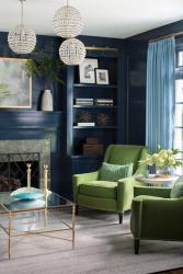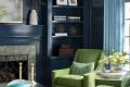 “The homeowners had the bookcases made in the sitting room so that we had two bookcases flanking the fireplace. This covered the absence of the window,” she says. The couple liked the idea of using navy blue paint and other dramatic touches. “The inspiration for the color palette—Susan has really good taste—were the fabrics used in the room.”