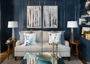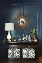 The pillows are silk fabric with shades resembling watercolors. Laura added blue drapery and modern wing chairs upholstered in green velvet to add a dash of modern charm to the space’s rather traditional tone. “We layered the lighting by adding a trio of sparkling crystal sphere light fixtures and brass picture lights over the bookcases—all on dimmers. Upholstered ottomans tuck under the console turned bar. To add dimension, we suspended black and white framed birch trees from polished nickel chains.”