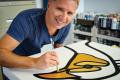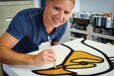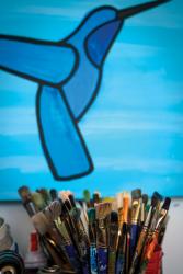 During Jeff’s process, he typically starts a painting with a sketch—either on the computer or on paper—and then transfers it to canvas. Next, he applies several layers of acrylic paint to get an extraordinarily smooth and flat application of color. Then, with his impeccably steady hand, he paints the bold, black outlines of the colorful birds that have become his signature mark.