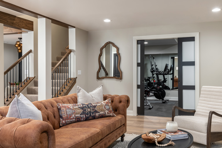 “At one point, we probably had the bar in every spot in the basement to see where it fit best. But when it came down to it, I had to think about how the couple would use the space. They’re the family that entertains every holiday season, so we wanted to have something that felt cozy and comfortable,” says Andrea. Although each smaller space is carefully delineated from the rest—a sliding door partitions off the small gym, for instance—Andrea and the couple agreed to avoid adding in any walls. “We wanted the basement to feel like an extension of the house, which is open concept,” says Jimmy.