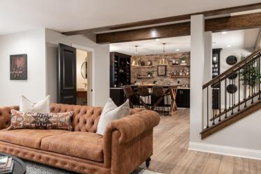 The couple decided to break up the large open floor plan of the basement into smaller sections. To help them determine the unique layout of their project, the couple turned to Andrea Liston-Jones, director of design at Liston Design Build. “They really had a new idea for an open concept, while still having multiple little spaces,” says Andrea, who helped Heather and Jimmy locate the perfect spot for each feature, including the proposed bar.