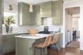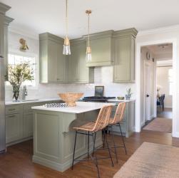 The homeowner wanted better function and style in her kitchen, so Karr Bick Kitchen + Bath packed a lot of style and charm into a small space. They found a perfect shade of Benjamin Moore green for the cabinetry to match her eclectic style. The custom island is the centerpiece of the space aand includes plenty of storage plus decorative corbels for style. Airy gold pendants suspended above the island complement the design perfectly. The designer chose a white subway tile that is an ideal accent to the marble-like quartz countertops and green cabinets. The hood over the range blends seamlessly into the cabinets to create a beautiful feature that doesn’t overpower the room. The previous butler’s pantry was changed into a bar area with glass cabinets for the homeowner to showcase their vintage china.