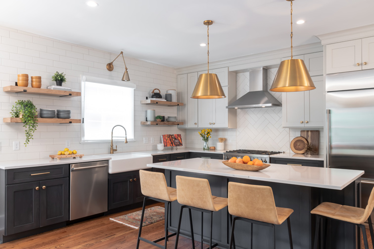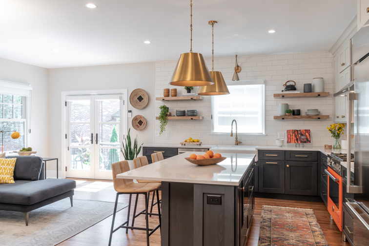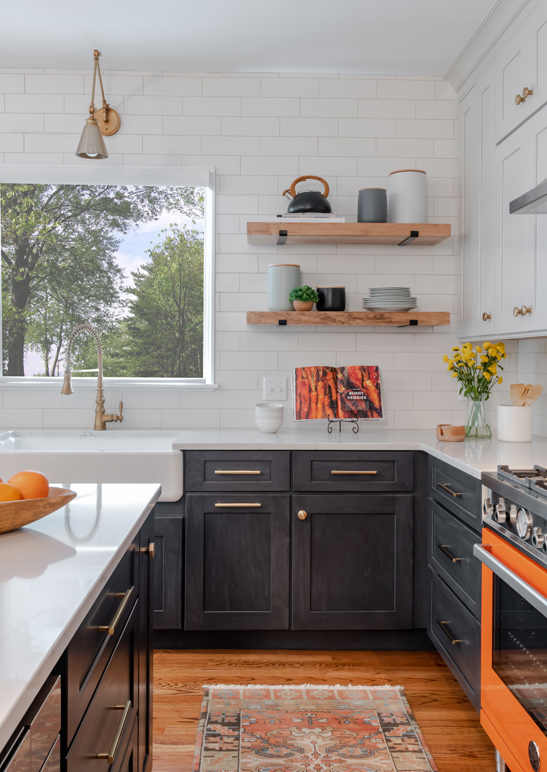 These homeowners were looking for a charming updated kitchen that connected to the outdoors, functioned for everyday living and offered island seating for the entire family. Liston Design Build reconfigured the layout increasing the overall footprint by extending cabinetry to the ceiling and incorporating a small bar area between the kitchen and dining room. Soft gray upper cabinets paired with white-and-blue veined quartz countertops provide a beautiful canvas for the space. The stained lower cabinets create drama punctuated by the focal point of the room, the sunset orange range that is the wow factor. White subway tile preserves the traditional style while the unique double herringbone accent behind the hood adds personality. The use of subtle cabinetry, tile and countertops gave the designer an opportunity to show off the radiant range. Dramatic honey gold pendant lighting anchors the island. The similarly finished arm light over the sink continues the sunset color spectrum. Gold suede island seating adds a cozy and luxurious element to the center of the space. The soffit above the hood presented a design challenge, but by framing it within the double herringbone backsplash design it is integrated cohesively. The strategic placement of the cabinetry, appliances and shelving has made the space larger, bright and more functional.