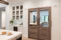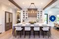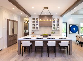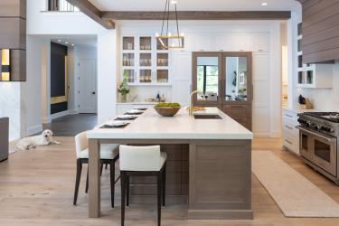 This new-build kitchen by Gegg Design & Cabinetry and Garrison LTD focused on clean lines. The space is visible from the large, open-ceiling great room, so the design had to complement the area. The designers chose clean white cabinetry accented with mid-tone rift white oak and horizontal grain center panels for a more contemporary feel. The island, hood and refrigerators were all constructed of the stained wood. Mirrored upper panels on the refrigerator fronts lighten the effect of the wood. The glass-front cabinet interiors are also rift white oak for warmth and contrast. The backsplash is a continuation of the marble-like quartz countertops. All kitchen appliances are integrated with matching fronts. The dual-fuel range and microwave drawer are in the galley island. The nickel-gap wood planing under island conceals functional storage while also complementing the hood. An adjacent finished open pantry and back hall foyer are styled the same as the kitchen and provide additional amenities. Brass light fixtures, brass and gunmetal contemporary hardware and neutral white oak floors finish the space.