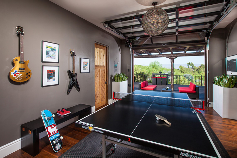 Chill Spot By Concept Design. This room was designed for a pro athlete as a place to chill. The designer added a roll-up garage door and ping pong table to extend the game room.