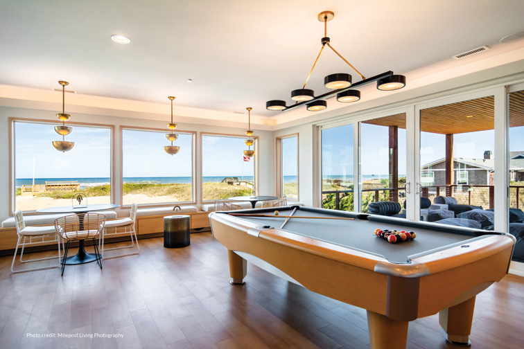 Oceanside Rec Room By SAGA Realty & Construction. The indoor entertainment area of the Transcendence vacation home on the Outer Banks includes sweeping ocean views, an elevator, rec room with arcade games and pool table, an indoor bar and theater room.