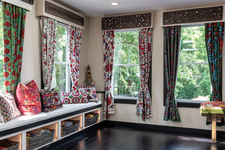One of the first things you notice when you walk into the room addition at Jacque Richmond’s St. Charles’ home are the brightly colorful window panels: Uzbek Suzani, sourced by Vintage Rug Land in Instanbul, Turkey. Each is unique, and they set the tone. This room is about vibrancy and energy. It was built for dance parties with live musicians, game nights and family dinners so large that 20-plus people can eat at the same long table, and, like the rest of Jacque’s home, it’s an eclectic mix of cultures with furniture and accessories from her travels around the world.