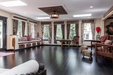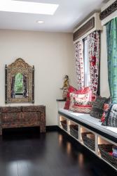 The furniture is sparse but meaningful: an antique Mughal daybed, a refreshed antique that Jacque purchased on the outskirts of the Boudhanath Stupa in Nepal and an antique Chinese Butterfly Style cabinet sourced by the Golden Triangle. There’s also a pair of mission-style chairs and built-in window seats with lighted cubbies underneath filled with games. All of it is easily pushed aside for the dance parties, Joyce notes, and there are floor outlets where the musicians set up.
