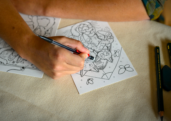She mainly works at her home in Rock Hill, but all she needs is a flat surface. “I sketch where I can. If there is a flat surface, I will be working on it. I love having music on and talking to people as I’m creating. It really adds to the work.”