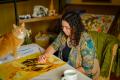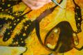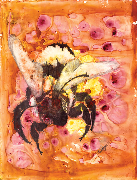 As an artist, she finds inspiration everywhere, but mostly in animals and nature. “I’m an illustrator at heart, so I love making concepts come to life,” Alison says. She doesn’t like to plan, but rather goes with “what feels right in the moment.” For one piece, she invited ants to walk across the pigment, putting honey in the middle of the painting to entice them. “They left these tiny trail marks all the way through . . . it turned out to be a beautiful piece, so I drew a huge ant with smaller ants being ridden by tiny people.”
