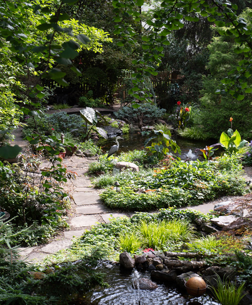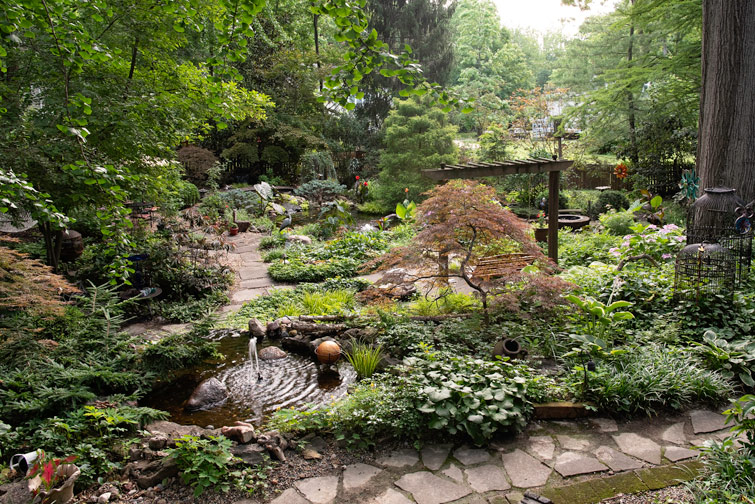 The centerpiece koi pond became her first big project. Twenty years later, now surrounded with mature plants, it looks as though it came with the historic home. Twelve years ago, she added the two-tiered waterfall, which adds the flow and sound of rushing water nearer the house.