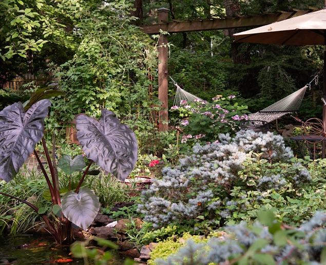 “Water features provide a place for so many beautiful plants such as water lilies and lotus,” she notes. “The sound of the water is extremely relaxing; you can just lay in a hammock, listen to the water and watch the fish.”