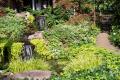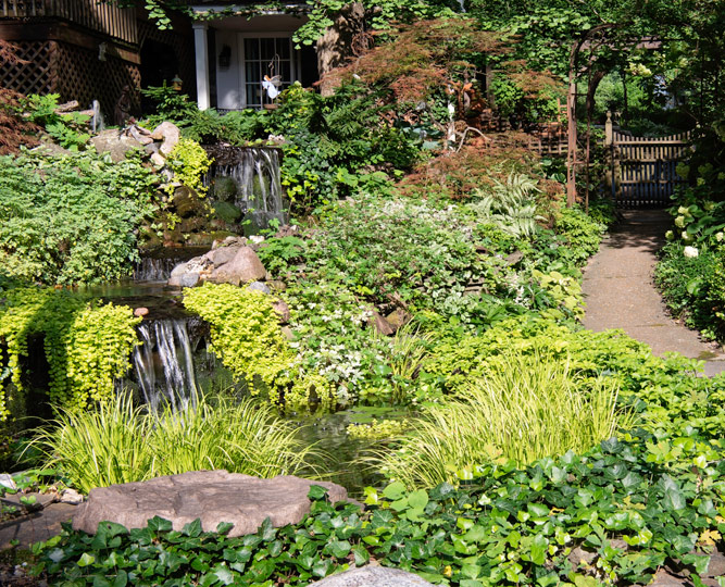 The red-tinged green of feathery Japanese maples and tufted foliage of Bonfire ornamental peach add to the symphony of shapes and textures. At ground level, spikes of ornamental grasses such as carex Ice Dance provide a contrast to the low-growing whorls of lime green pachysandra: chartreuse trailing creeping jenny and heart-shaped, dark green English ivy that cover the soil along multiple pathways.