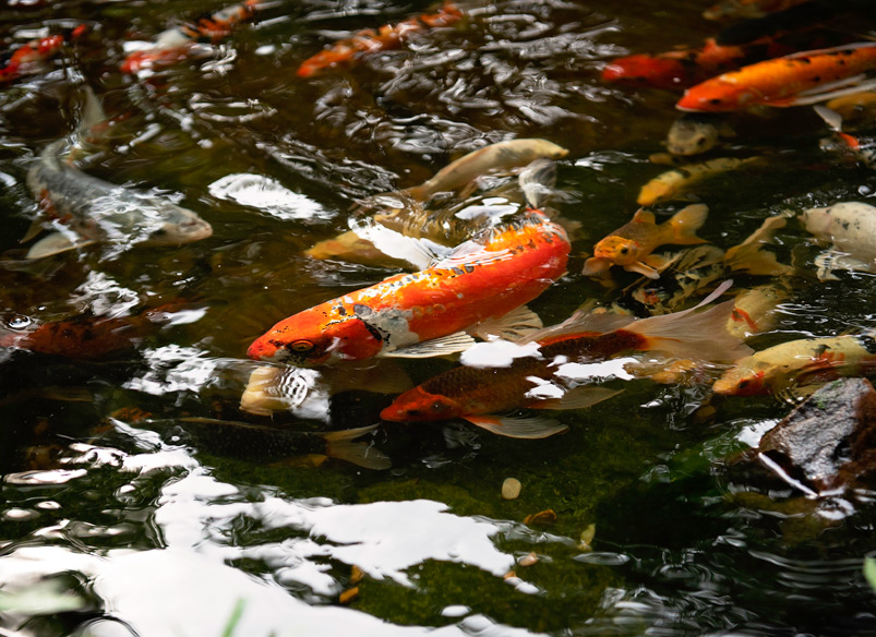 The beauty and sound of water enhances the richness of the landscape. It flows via a two-tiered waterfall that cascades from the top of the garden and ripples in the lower-level pond that flashes with orange and golden koi.