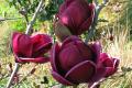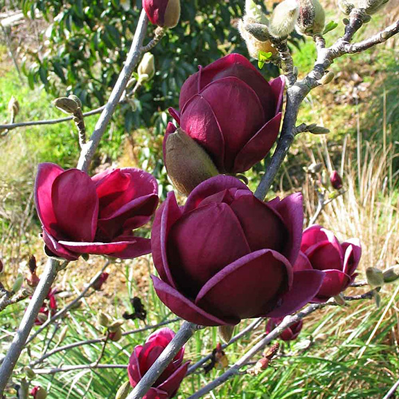 Fifteen years of breeding produced the special and compact Magnolia Genie. This smaller tree produces loads of sensational black-red blossoms that open to a deep, velvety red with a slight aubergine hue. These showy Tulip-shaped flowers open in spring and, if kept well watered, will rebloom in summer. This petite pyramidal tree matures to about 10-13 feet tall, making it ideal for plantings near patios, flanking doors against homes or tucked into mixed gardens. Ann Lapides, Sugar Creek Gardens.