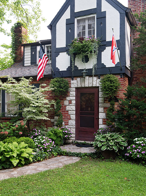 A mélange of greens in a variety of textures welcomes visitors to her English Tudor home: the dark green, heart-shaped leaves of English ivy provide a carpet for chartreuse fans of mounded hosta. Backing the hosta, more structured, tiny leaved boxwoods lead to feathery stands of Japanese painted fern and maiden hair fern, flowing from the door-side urn. A delicate mix of white and lavender impatiens provides the only other color. White-edged hosta on one side of the front door is repeated in the creamy leaf margins of the variegated dogwood on the other side of the entrance.