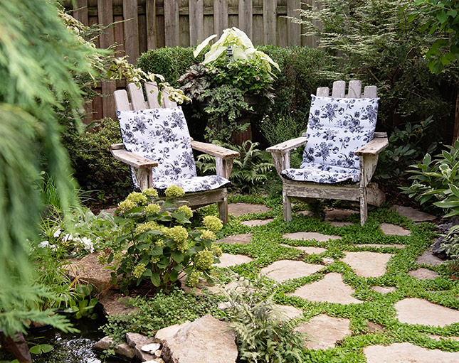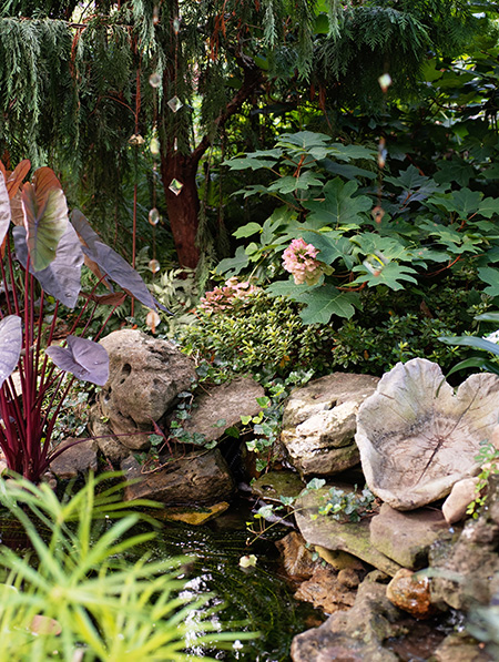 With her talent spread wide, it is in her own garden in Spanish Lake that she has put down her deepest roots. Her English country landscape, which she began from scratch in 1995, reflects the Tudor architecture of her home. “I have been in love with England and Scotland ever since I realized those places really existed and were not just something I read about in story books,” she says. Those childhood pictures are recreated just three minutes from I-270. Mulch softens log-lined pathways. A carpet of the groundcover mazus reptans, interspersed with stepping stones, provides an open lawn for strolling chickens that seem to have stepped out of a Beatrix Potter sketch book. Small, bubbling water features make a charming addition to garden beds.