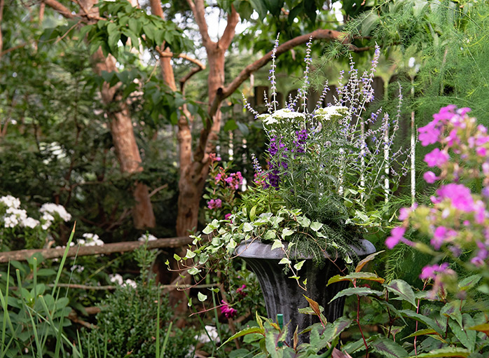 Even in the summer, she relies on texture, shades of green and variegated plants with shots of white. “This is where I come to relax,” she says of her own garden. “I am out dealing with people and their gardens all day. I don’t want to be in your face with color when I come home. I use lots of white and then maybe purples and pinks”