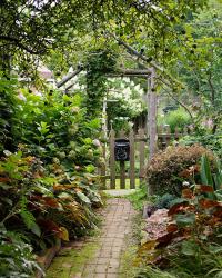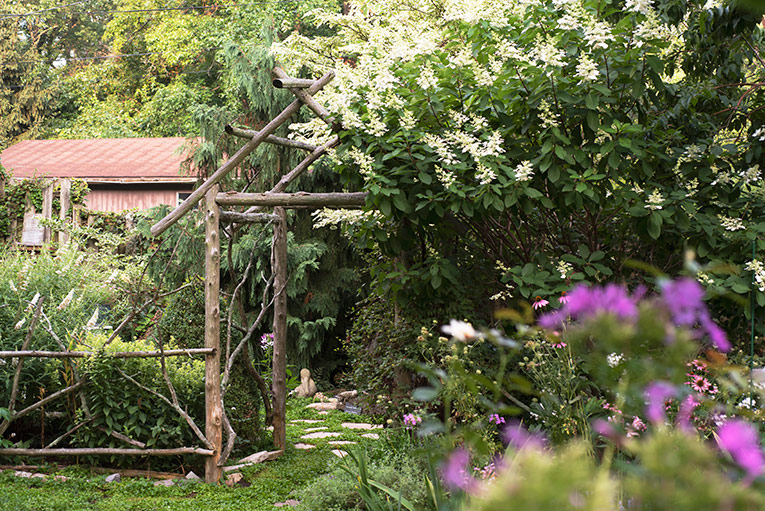 In the back, a flowing rustic fence and arbor created by Jo and a friend from tree trunks and branches divides the space into sunny and shady areas. On one side of the arbor, the conical white blossoms of a tree-like Tardiva hydrangea arch over the arbor and seem to point toward the graceful, triangular wands of the white butterfly bush, mimicking a similar shape on the other.