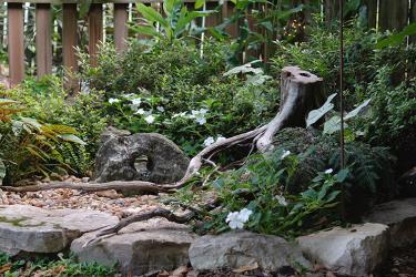 The sculptural, free-form lines of water-washed driftwood, reclaimed from the shores of the Mississippi and Missouri Rivers, act as garden ornaments along fence lines and beside pathways.