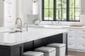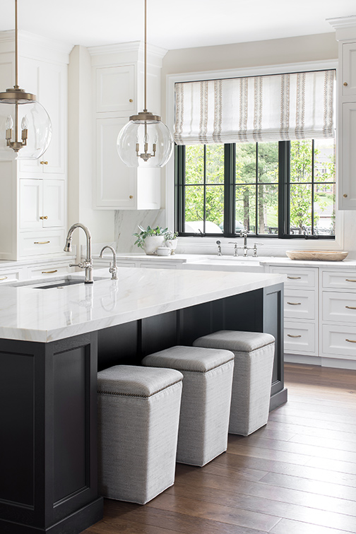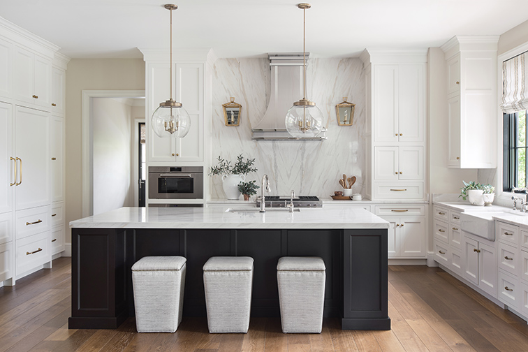 For the kitchen design of this new home, Kathy felt it was essential to unite timeless—not trendy—details with functionality. Every element was carefully considered, from the inset painted cabinets and the warm tone of the island and butler’s pantry to the interiors of every cabinet and drawer. A marble countertop lends a luxurious, timeless feel, and all these special details work together to create a cozy hub where everyone loves to gather. Wolf appliances and Plato custom cabinets especially accommodate the demanding lifestyle of the homeowner, who loves to entertain.