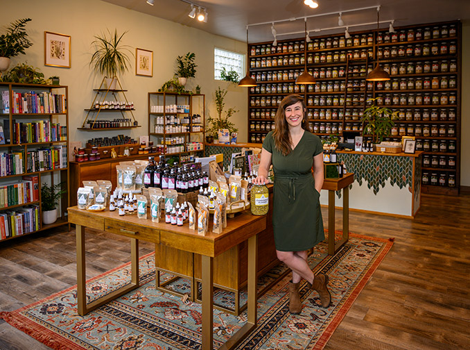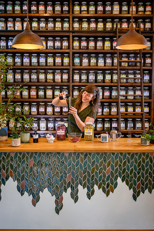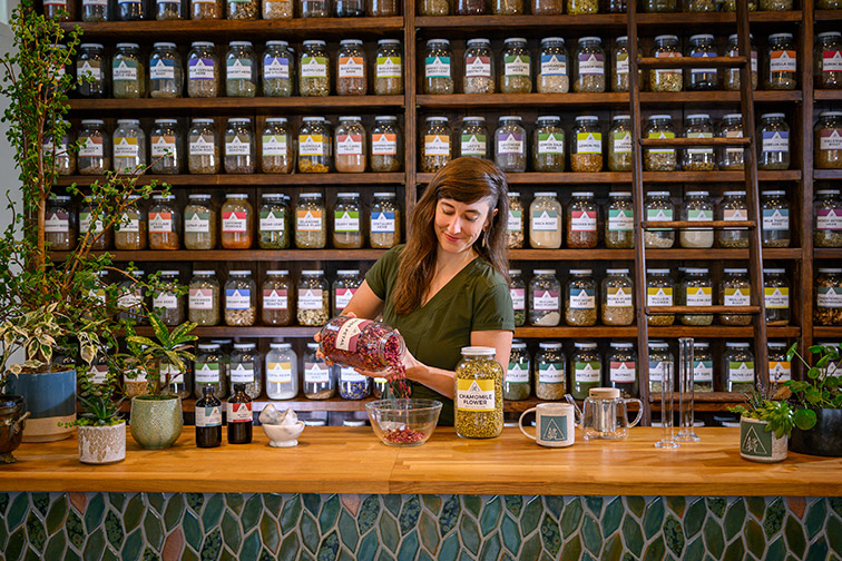 Like a colorful art display, all of the 300 herbs at the St. Louis herb shop and clinic Forest & Meadow sit on shelves in glass jars on a wall. “This was a must-have when we were designing the space because I wanted folks to be able to actually see the plants, interact with them, be drawn by them,” says Amanda Jokerst, a Certified Clinical Herbalist, and the owner of Forest & Meadow, located in the Lindenwood Park neighborhood. “It is truly captivating to take in all of the different colors and textures, the richness of the natural world, all of these plants that offer their healing benefits.”
