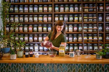 Amanda opened the store in 2019 after seeing a need for high quality herbal medicine in St. Louis. At the shop, clients can explore how to support their health in a more holistic way than just symptom management, to get to the root of their concerns, she says. For example, you can come in for a remedy to help with symptoms of the cold or flu, but you can also work with a Certified Clinical Herbalist to understand how to nourish the immune system and support your body with dietary and lifestyle changes to help prevent your body from becoming susceptible to contracting a cold in the first place.