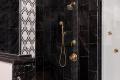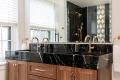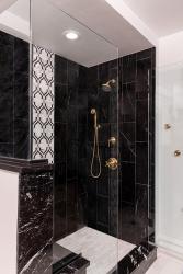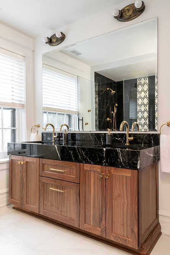 “The second major component of the design was the black marble,” continues Signorelli. “That’s probably what really sets this bathroom apart.” The homeowners fell in love with the idea of a walnut vanity and Nero Marquina black slab on top. With the designer’s help, they decided to miter the vanity countertop 6 inches high to add drama. To fulfill the homeowner’s wishes for extra storage, they added a matching walnut linen cabinet to the left of the toilet.