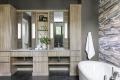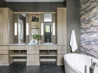 Every design decision in this spectacular home was made with multigenerational living in mind. The goal was to create a beautiful, high-end residence that allowed for comfort, independence and accessibility for people of all ages and abilities. Designers Castle Design and R.G. Apel Development blended beauty with purpose in this 190-square-foot bathroom embracing a contemporary, yet warm, soothing aesthetic. The cabinetry features easy-open push control doors and finger pull drawers. A diamond-shaped tile in olive green with charcoal grout plays well with the wall color and adds interest on either side of the vanity mirrors and contemporary LED sconces. The designer dropped the mirrors all the way to the warm white quart countertop to accommodate the sight line of a wheelchair user or child. Dark gray porcelain tile with subtle white veining is not only striking but a practical choice to camouflage scuff marks from wheelchair tires. A freestanding tub features faucets at the front right corner instead of the back of the tub making it easy to manipulate. The designer chose a stunning wallcovering in shades of white, gray, blue and beige, which mimic the hues in the rest of the space and bring to mind soothing colors of the beach, sky and mountains. The designer for this project volunteers her time to make selections for the entire home with a portion of the sale’s proceeds going to DRAFT (Disablitiy Rights Advocates for Technology) and Segs4vets.com.