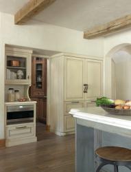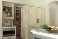 Walking into the 461-square-foot kitchen, you feel as though you’ve been transported to France. Reclaimed wood beams on the ceiling add a rustic element. By minimizing modern appliances as not to give a too “kitcheny” look, brooksBerry Kitchens & Baths was able to create an Old World French atmosphere. A monumental stone and hammered pewter hood top the French range. The island is styled to resemble a distressed flower shop workbench in a pewter matching the hood. Next to the cooktop, two recessed niches house spices and oils. A coffee bar off the breakfast area features a sink and iron étagère. A wide plank, distressed lime washed floor complements the Old World style. One challenge brooksBerry faced was designing the kitchen around four doorways and a wall of windows.